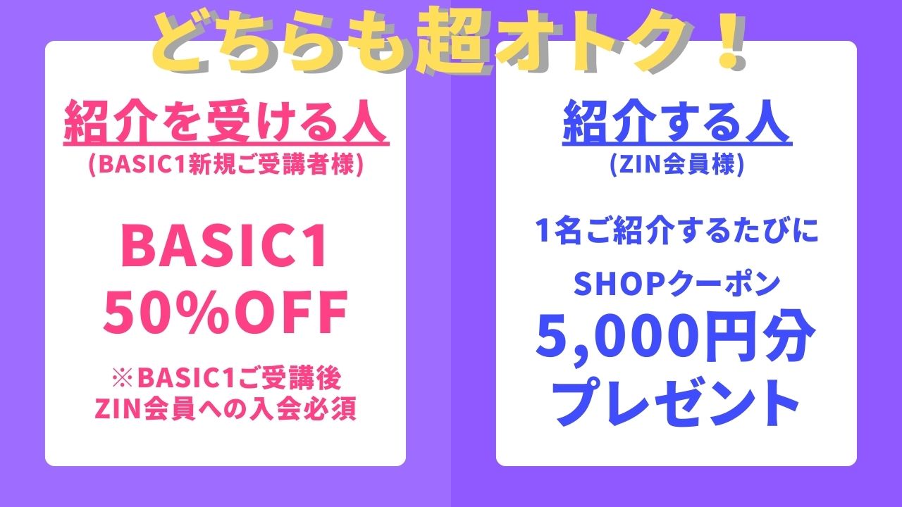 ● 【通常開催】【オンライン講座】は、BAISC1講座受講後、1週間以内でのZIN会員入会書類提出、またはWEB入会手続きを必須条件、【動画学習】は、BASIC1動画をご購入後、1ヶ月以内でのZIN会員入会書類提出、またはWEB入会手続きを必須条件とさせていただきます。 ご入会がない場合は、新規受講者、紹介者への特典も無効とさせていただきます。
