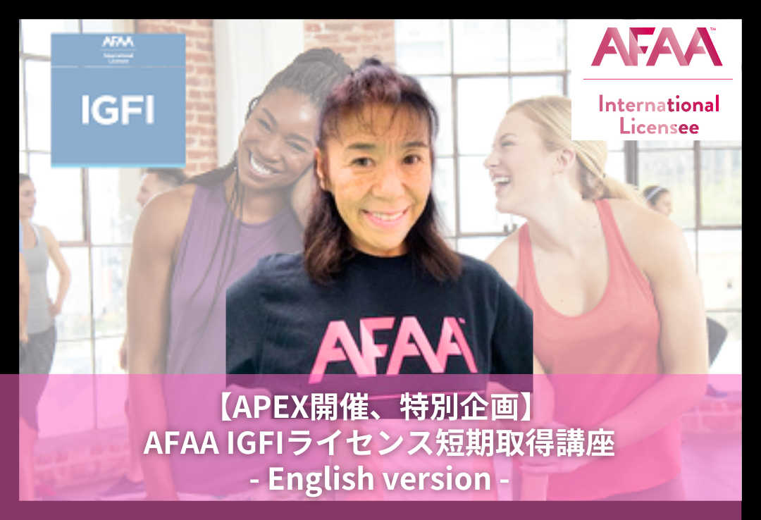 国際ライセンスであるAFAA IGFI (インターナショナルグループフィットネスインストラクター)認定取得を目指します。オンライン配信で3時間×4回、全国全世界どこからでも受講できます。最...