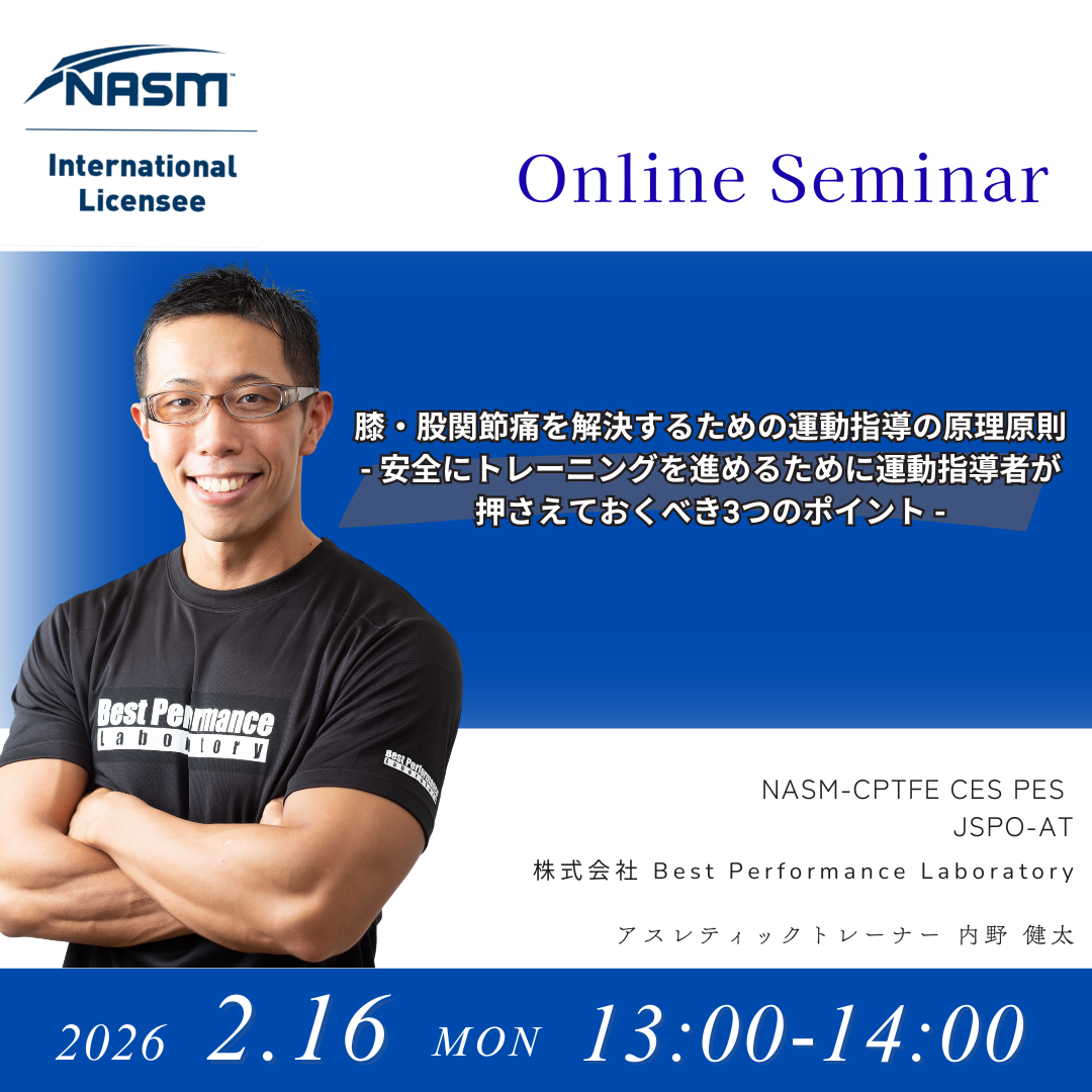 【タイトル】 「膝・股関節痛を解決するための運動指導の原理原則 - 安全にトレーニングを進めるために運動指導者が押さえておくべき3つのポイント -」 日時:2026年2月16日(月)...
